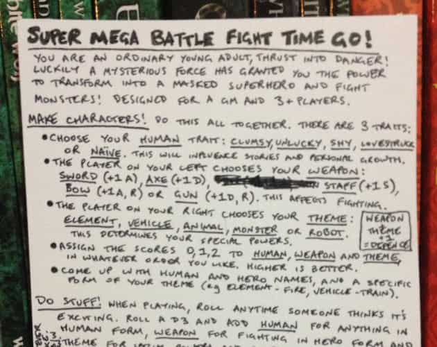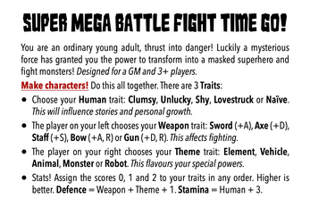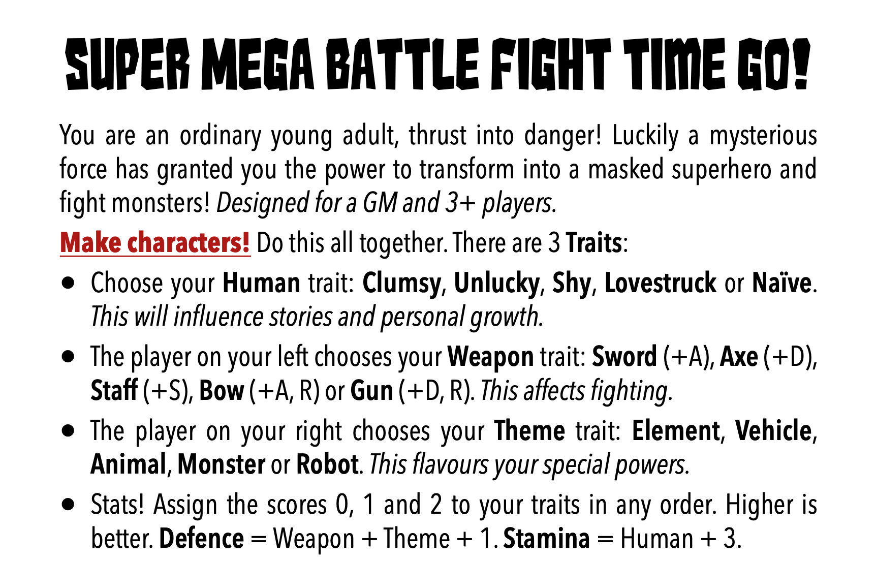 Life can be tough when you’re a teenager – and being attacked by monsters all the time doesn’t make it any easier! Super Mega Battle Fight Time Go! is a mini-RPG for a GM and 3 or more players. You play young adults suddenly gifted with the power to turn into masked superheroes, who must fight monsters – and deal with the social challenges of being young adults! It’s inspired by Japanese tokusatsu TV shows like Kamen Rider and Super Sentai (aka Power Rangers).